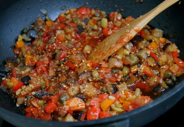 Когда все ингредиенты объединятся, содержимое кастрюли тушат на медленном огне около 20-25 минут. Важно периодически помешивать, чтобы ничего не пригорело. За пять минут до готовности добавляют мелко нарезанную зелень и оставшееся масло. Готовая икра должна приобрести однородную консистенцию и темно-коричневый цвет. По желанию можно измельчить часть икры блендером для более нежной текстуры, оставив часть кусочков для контраста.