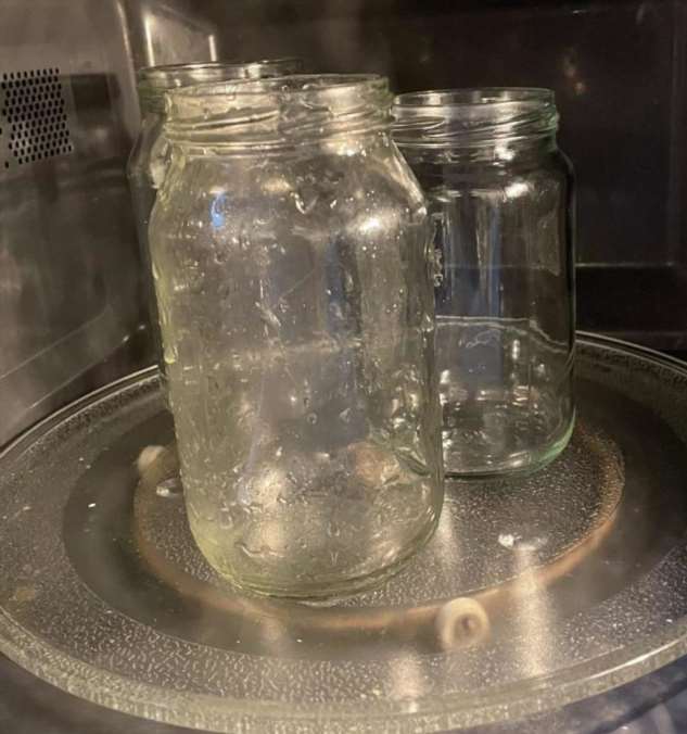 Этот способ позволит простерилизовать за один раз 6-7 маленьких или три банки среднего размера. Крышки стерилизовать придется отдельно: вода из них слишком быстро испаряется. Ни в коем случае нельзя в микроволновке нагревать металлические крышки.
