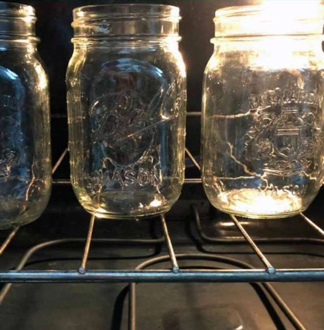 Расставьте банки в духовке на решетке или на противне на расстоянии 2 см друг от друга. Стерилизацию начинайте в холодной духовке, а затем разогрейте ее до 150 °С и продолжайте стерилизовать банки объемом до 3-х литров 20 минут. Отключите духовку. Приоткройте дверцу и дайте банкам остыть в течение получаса.