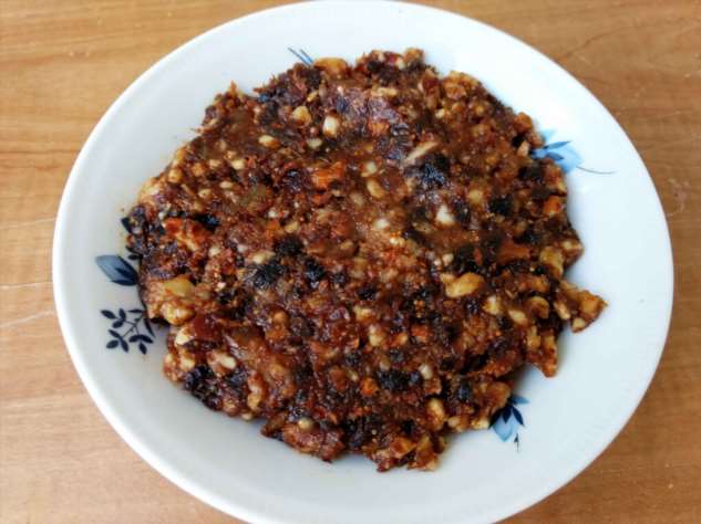 Измельчите с помощью мясорубки яблоко, финики и орехи. Добавьте корицу и перец. Перемешайте ингредиенты так, чтобы у вас получилась однородная вязкая смесь.