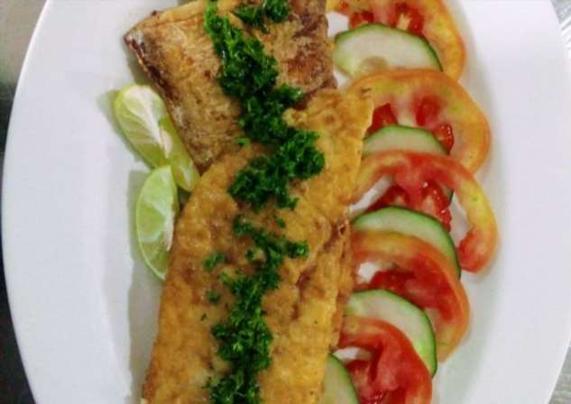 - После этого рыбка окунается в яичную массу. Каждая сторона обжаривается на сковородке до румяности.