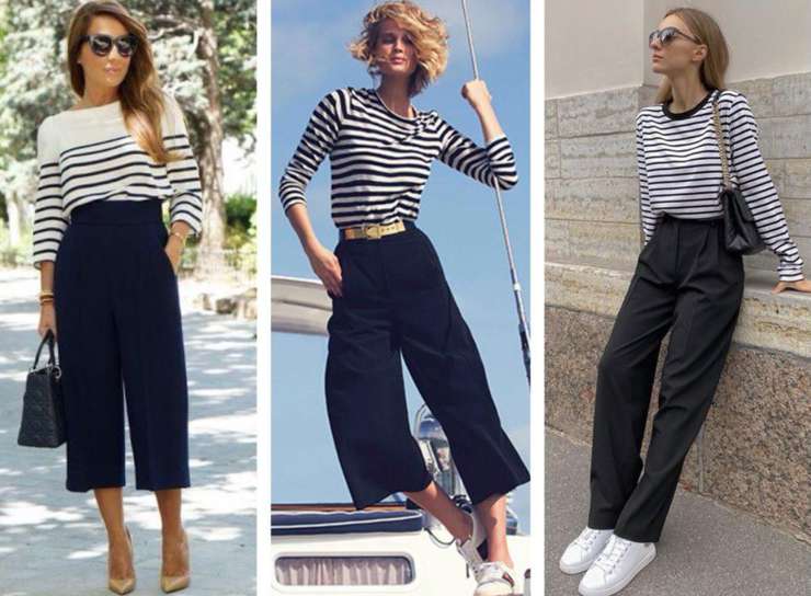 Широкие брюки — хит последних сезонов, и тельняшка с ними смотрится просто великолепно. Представьте себе белые палаццо или бежевые льняные брюки, к ним — слегка приталенную тельняшку с рукавом ¾ или расклешенными манжетами.