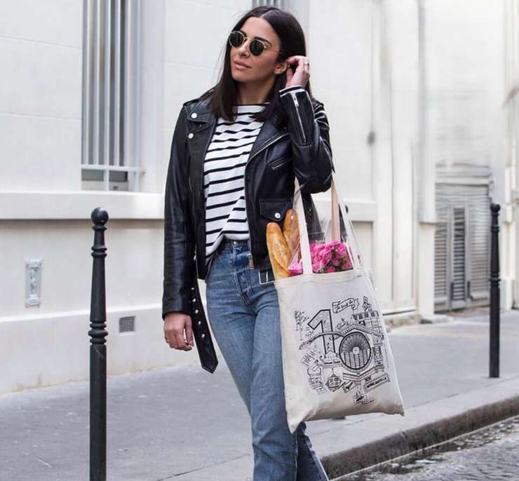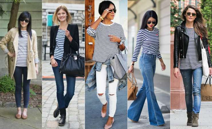 Джинсы и тельняшка — классика, но чтобы образ выглядел современно, выбирайте необычные фасоны. Например, джинсы с завышенной талией и прямым кроем или актуальные в этом сезоне бермуды из денима.