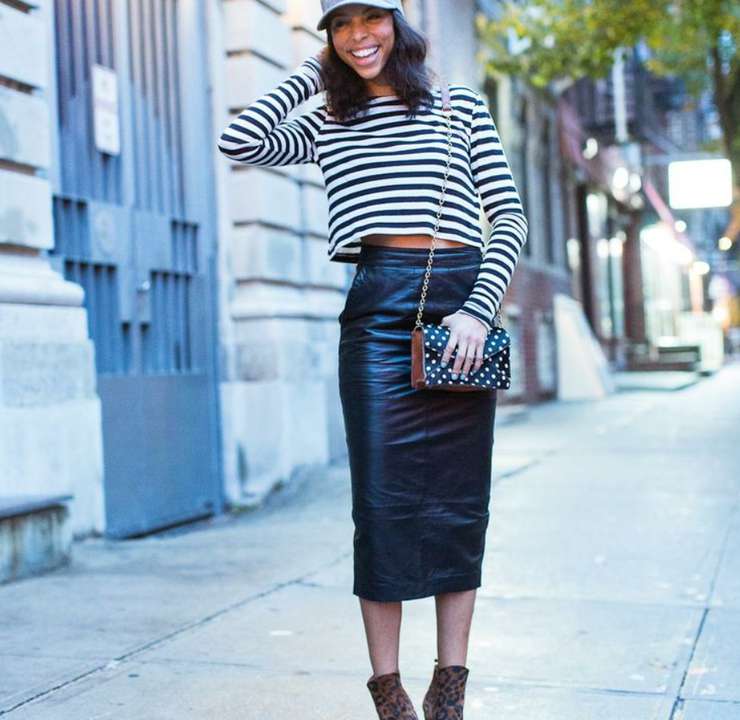 Если хочется чего-то женственного и утонченного, сочетайте тельняшку с юбкой миди. Плиссированная модель добавит легкости, кожаная — дерзости, а струящаяся шелковая — изысканности. Чтобы образ выглядел актуально, тельняшку можно заправить в юбку или небрежно выпустить наполовину.