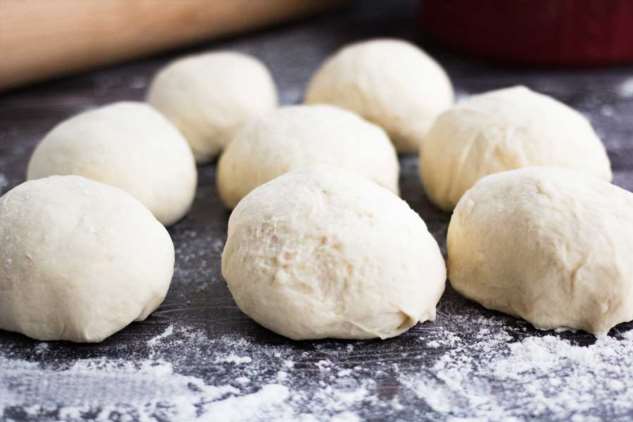 - Далее тесто выкладывается на припыленную мукой поверхность, из него формируется жгут. Затем разделите его на восемь равных частей. Вес каждого кусочка должен составлять примерно 70–80 граммов.