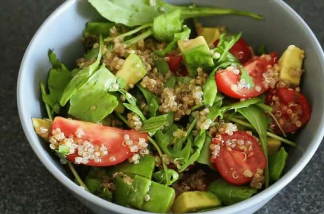 Приготовить киноа. Для этого необходимо промыть крупу в мире, переложить в кастрюлю, влить 4 ст. холодной воды, посолить и перемешать. Поставить на огонь. Когда вода закипит, убавить огонь, накрыть кастрюлю крышкой и проварить еще 15 минут, пока крупа не впитает воду. Лучше всего брать кастрюлю побольше, так как в процессе варки киноа увеличится в три раза.