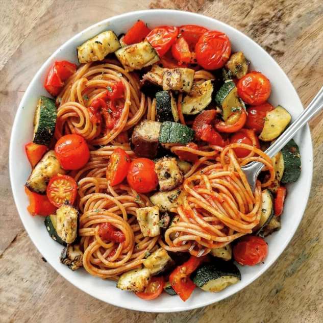 Это довольно вкусное, сбалансированное блюдо, которое дарит чувство сытости и отлично подойдет для вегетарианцев. Необходимо просто приготовить пасту, желательно из цельного зерна. Затем добавить в готовое блюдо обжаренные овощи, в частности, такие как грибы, брокколи, помидоры. Все это приправить маслом оливы, базиликом, чесноком и пармезаном.