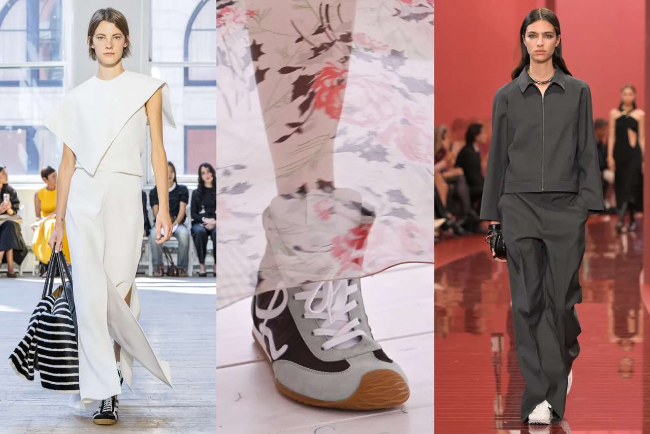 «Важно, чтобы брюки были немного укороченными или слегка расклешенными — тогда кроссовки будут видны и станут ключевой деталью образа — несколько хулиганского, но очень интересного», — советует стилист.